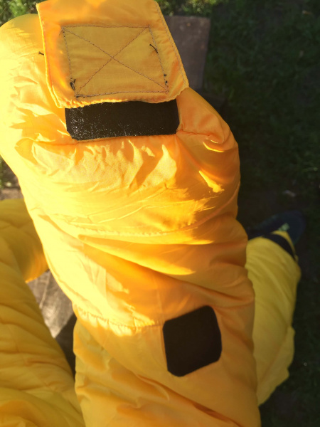 Oblek je vybavený spoustou vychytávek. Mezi mnou využívané patří např. dvojitý zip na hrudníku, který slouží pro pohodlné oblékaní. Možnost odepnout papučky je skvělá, pokud jdete v noci na záchod a potřebujete si obout boty. Chození v papučkách doporučuji maximálně do stanu, jinak v nich nohy docela kloužou. Příjemná je možnost kompletně si schovat ruce do rukávů a zároveň jednoduché zajištění konců rukávů suchým zipem v případě, že chcete mít dlaně venku. Ruce jde zastrčit do klokaních kapes v úrovni boků. Kapuci jsem neměl potřebu nijak regulovat, i když to oblek umožňuje. V teplejších podmínkách jsem ocenil možnost rozepnout větrací zipy na stehnech.